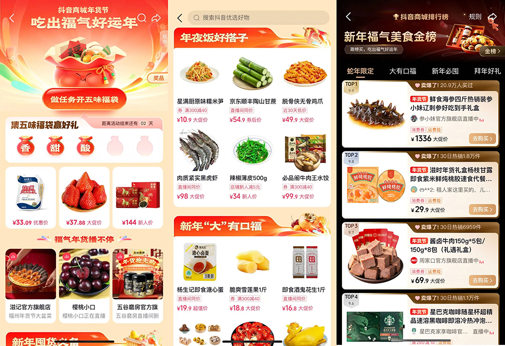 2025「吃出福气好运年」◈★★✿,新春佳节是大家阖家团圆大饱口福的好日子◈★★✿,1月7日-1月12日◈★★✿,抖音商城年货节食品酒水品类日顺利收官◈★★✿。抖音电商通过增量供给新年特色品类商品◈★★✿,打造丰富的营销活动及多元内容主题直播◈★★✿,成功撬动海量用户参与互动◈★★✿,也让商家收获更多节日生意增量◈★★✿。