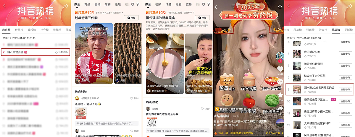 品类日期间◈★★✿,与新年食饮相关的热点话题层出不穷◈★★✿,每日一热点◈★★✿,助力商家生意爆发◈★★✿。活动累计投稿量4.5万+◈★★✿,登上抖音热榜14次◈★★✿,最高登热榜TOP1&种草榜TOP1◈★★✿,最高1天有7个热点◈★★✿,#腊八美食图鉴 登上抖音热榜TOP2◈★★✿,#南北方办年货区别这么大吗 登上热榜TOP4◈★★✿,还有其他多个上榜热点如 #过年唠嗑三件套#福气满满的新年美食◈★★✿。活动期间上线的短视频挑战赛「测一测2025老天赏的饭」◈★★✿,吸引大量用户参与互动◈★★✿,相关线◈★★✿,并同步带动看后搜增长◈★★✿,搜索PV爆发631%◈★★✿。